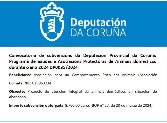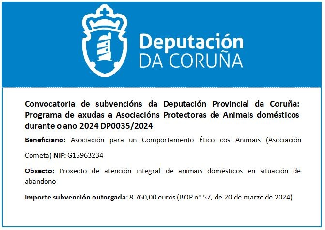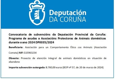 No ano 2024 optamos a unha subvención para a axuda das facturas e gastos veterinarios, alimentación, etc... de dito ano. Estamos en fase de xustificación da mesma.