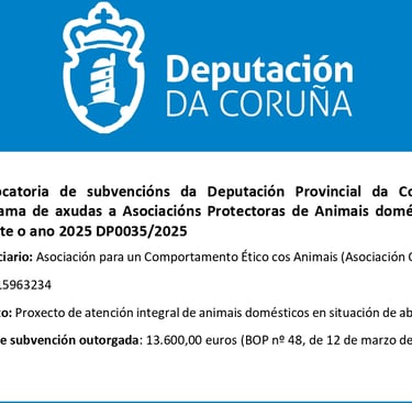 No ano 2025 optamos a unha subvención para a axuda das facturas e gastos veterinarios, alimentación, etc... de dito ano. Estamos en fase de xustificación da mesma.